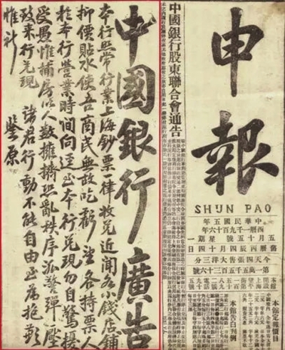 1916年5月12日,北洋政府不顾百姓利益和金融安危,下达“停兑令”,即中国银行和交通银行等发行的纸币不得兑现,应付款项不准付现。全国金融市场一片哗然,挤兑风潮愈演愈烈。鲁迅在《灯下漫笔》中写道:“我还记得那时我怀中还有三四十元的中、交票,可是忽而变了一个穷人,几乎要绝食。”一些政商“达人”利用币值涨落大做投机生意,“停兑令”不得人心。在这关键时刻,中国银行上海分行率先抵制“停兑令”,登报通告(见左图)延长营业时间收兑钞票。中国银行山西分行积极响应,准备充足白银,为客户一一兑付。到1916年5月19日,挤兑风潮完全平息。