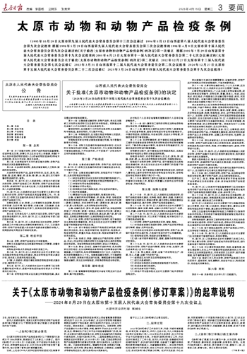 《太原市动物和动物产品检疫条例》已由山西省第十四届人民代表大会常务委员会第十九次会议于2025年3月26日批准,现予公布,自2025年5月1日起施行。