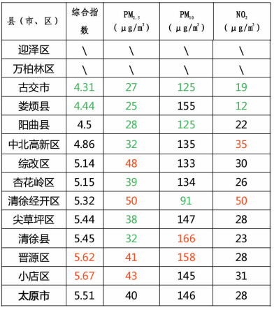 1.综合指数、PM10和NO2指标排名前两位的标为绿色,排名后两位的标为红色;