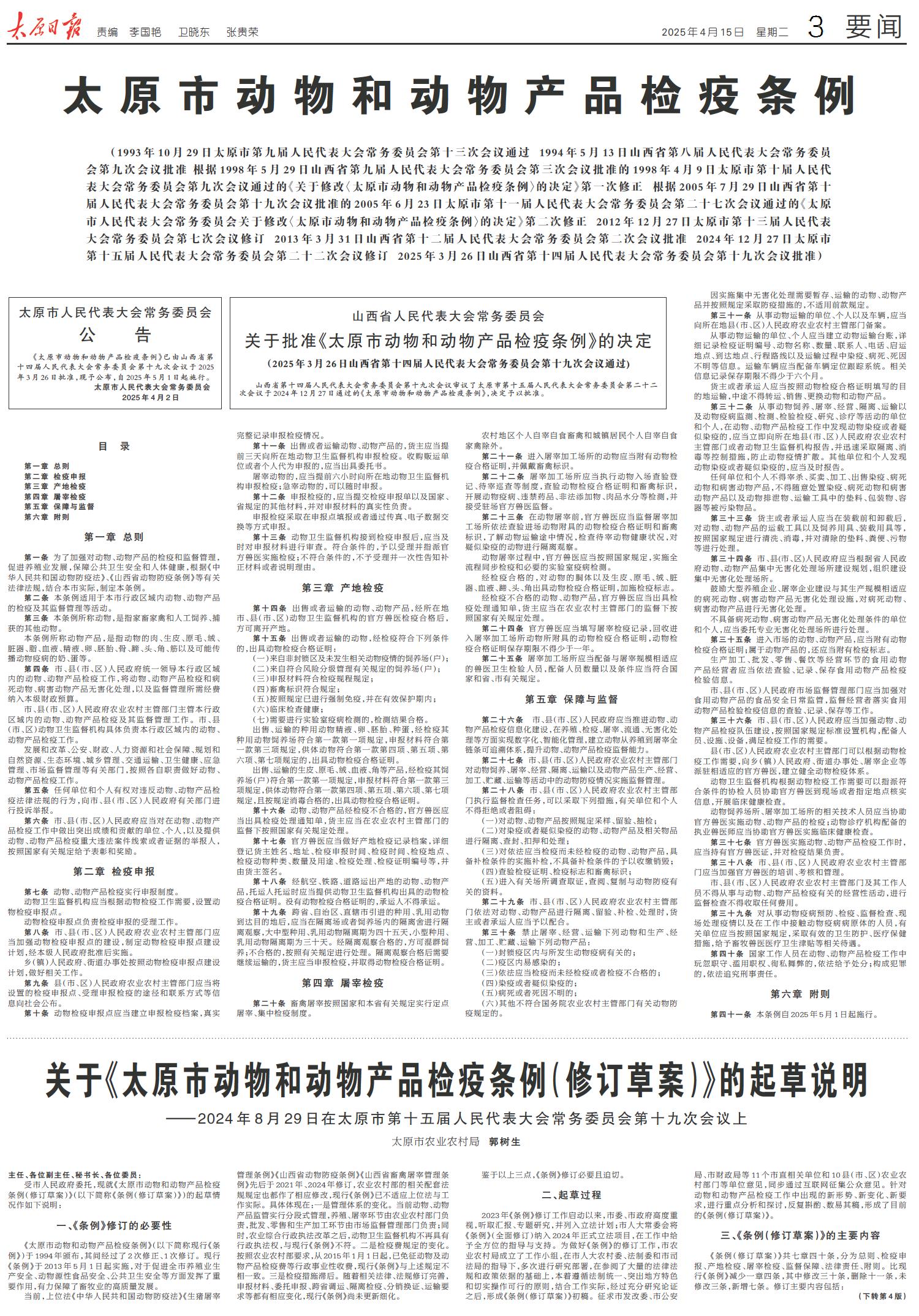 关于《太原市动物和动物产品检疫条例(修订草案)》的起草说明