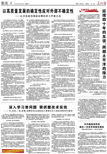 中共中央政治局4月25日召开会议,分析研究当前经济形势和经济工作,强调“坚定不移办好自己的事,坚定不移扩大高水平对外开放”“以高质量发展的确定性应对外部环境急剧变化的不确定性”,作出一系列重要部署,为进一步坚定各方发展信心、积极有效应对困难挑战、不断稳固经济持续回升向好基础指明前进方向和发力重点。
