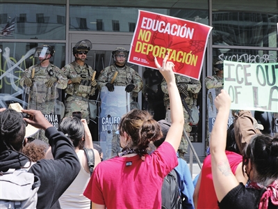 6月9日,在美国加利福尼亚州洛杉矶一处联邦机构建筑外,示威者与国民警卫队人员对峙。新华社发