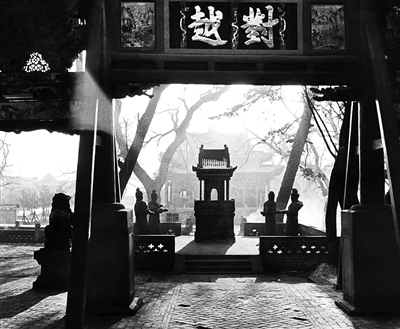 根据上下文,如果“越”解释为“宣扬”,只是在诸侯中宣扬他的美德,“戎狄怀之”则不通。所以,“越”应该解释为“出使”。根据《象形字典》的解字法,从字结构解释“越”字本义,越从“走”从“戉”,戉是代表王权的大斧子。《象形字典》的解释为“离开大斧子”“远离战争”。笔者认为,《象形字典》的拆字方法是正确的,但释义出现偏差,因为“越”字从来没有逃避战争的含义和应用。笔者认为,“越”从“走”从“戉”,是“行走的代表王权的大斧子”“行走的仪仗”。大斧子和仪仗当然不会自己走,是“人手持行走”或“车载行走”。这就是《尔雅》“越,扬也”的真实含义,越,是手持仪仗行走。“对越”连起来,对,取义“偶对”;越,取义“行走的王钺(仪仗)”,即“成对的人高举仪仗、或车载仪仗,行走在帝王前面”。这种仪仗是王权的象征,可以代表帝王出使诸侯、他国,如帝王亲临。“慎勿越”“僭越”,都是说除了这种仪仗队,不允许任何人超越帝王,在前面这个位置上。超越、跨越等义,都源于此。古代文献里,“越”作为车驾仪仗出行的应用有很多。如《左传·昭公二十六年》:“惠、襄辟难,越去王都(惠王、襄王避难,车驾仪仗离开王都)。”“震荡播越,窜在荆蛮(车驾仪仗一路颠沛,奔波在荆蛮之地)。”现在的对越坊前(东)为金人台,后(西)为献殿。从晋祠对越坊视角审视“对越”二字,对比晋祠百年前的老照片和解放后的相关修缮记录可以发现,对越坊原匾正面(朝东)是“万古流芳” ,背面(朝西)才是“对越”。新中国成立后修缮时,把匾翻转,“对越”二字朝向了东面。对应金人台上四个铸铁武士,两两相对,八臂空虚,原来手中都有武器仪仗,正是“对越”二字的直观解释。由此,笔者认为,对越坊并不是高应元见缝插针建在隙地,而是和金人台有直接对应关系,金人台应是圣母祠(惠远祠)门前仪仗护卫。再回到“对越”原始出处《诗经·周颂·清庙》,以“王权仪仗”代入原文,便可看出,这首诗,描述了宗庙里文王的仪像、臣子们和仪仗队伍,反映出古代宗庙初衷:祭祀在天先祖,慎终追远,事死如事生。