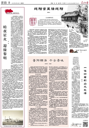 传说故事虽多了几分神话色彩,但从故事中描绘的“八角重檐亭”“九窑十八洞”等明清时期建筑来看,故事的创作时间并不久远。而在前人们的艺术加工中,吕洞宾与清新飘逸的“诗仙”李太白两人的形象竟神奇地重合到了一起。在清光绪版《山西通志》对于太原纯阳宫的记述中,也有着李白的身影: “太原府纯阳宫在贡院东天衢,明万历年朱新场朱邦祚建。相传规划皆仙乩布置。内八卦楼,降笔楼。亭洞幽曲,对额皆乩笔。题碑二,一钟离权乩笔,一李太白乩笔。”李白形象的出现,究竟是前人的无心之举,还是有意为之?