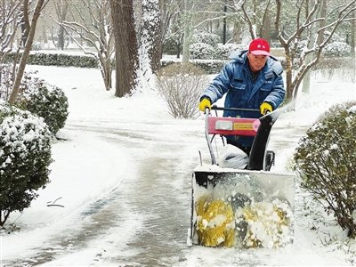 工作人员在迎泽公园清扫积雪。韩双喜 摄