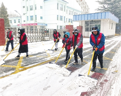 清徐县育青路段,清徐农商银行30余名员工组成志愿服务队,携铲雪板等专业工具,与环卫工人、社区网格员并肩作战。