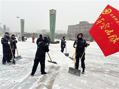 降雪后,老军营街道老军营小区第一社区、劲松社区等立即联动驻地单位、志愿者、环卫工人和商户,开展“边下边清”作业,扫除积雪、铲掉冰层。多家临街店铺还为清雪人员免费提供爱心八宝粥,让严寒中的清扫工作既有力度,更显温度。
