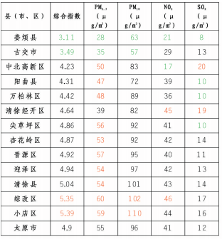 1.综合指数、PM10、NO2和SO2指标排名前两位的标为绿色,排名后两位的标为红色;