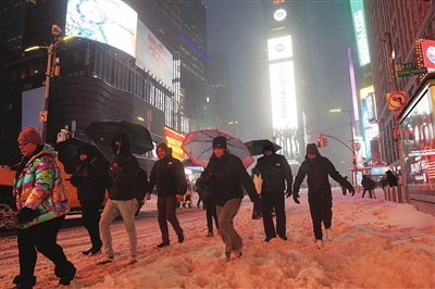 1月25日,在美国纽约时报广场,人们在雪中行走。