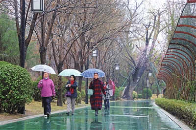 3月14日,绵绵春雨中,市民在迎泽公园散步赏景。张昊宇 摄