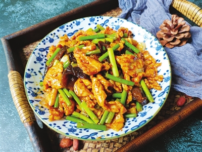 太原“八大碗”的做工也十分讲究。以有着“三晋一味”称号的过油肉为例。先将选好的上等猪里脊顺着纹理切成一元硬币厚的肉片,放在碗中,加入调料、蛋液、淀粉后抓拌均匀,然后放进油锅中炸,直到肉皮成为黄红色后出锅备用。随后将炸了里脊肉的油倒出去一部分,继续将锅中的油加热,等油热之后,放入花椒、大料、葱、姜、蒜爆香,再将切好的蒜薹、冬笋片还有泡发好的黑木耳放入锅中翻炒,倒入刚才过了油的里脊肉,随后沿着锅边淋入一点山西老陈醋,烹出醋香后再加入一勺花椒水,紧接着加入盐、生抽调味,开大火翻炒。等蒜薹炒至断生后,加入适量老抽调色,再淋入水淀粉勾芡,使芡汁完全包裹住食材,锁住香味,就可以出锅了。就这样,一道酥软鲜香、肥而不腻的过油肉便登上了宴席。