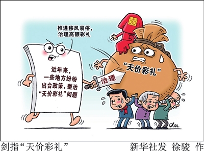 近年来,一些地方纷纷出台政策,整治“天价彩礼”问题。比如,河南省宁陵县将婚丧礼俗规定普遍纳入村规民约,倡导彩礼不高于3万元。宁夏回族自治区八部门日前联合印发高额彩礼专项治理的实施意见,制定了12条正向引导措施和5条负面约束措施。