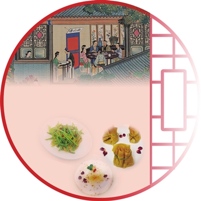 《清孙温绘全本红楼梦图》之一中的家宴场景 芦蒿炒面筋 糖蒸酥酪 豆腐皮包子 以上美食均由“红迷”青平烹制并拍摄