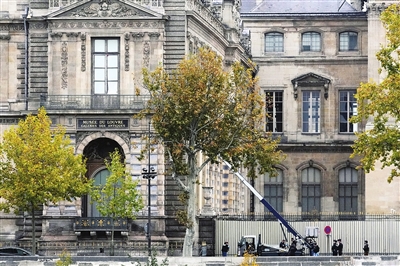 10月19日,在法国巴黎,警察聚集在卢浮宫博物馆外。新华社/美联