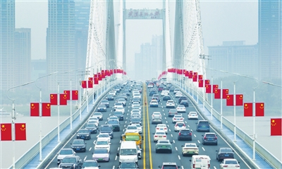 2025年10月1日,国庆假期第一天,车辆行驶在湖北省武汉长江二桥上(无人机照片)。新华社记者 肖艺九 摄