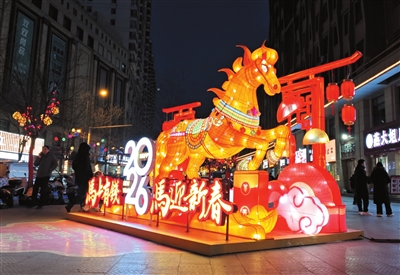 服装城前的广场上,“马迎新春”主题花灯组格外醒目。骏马花灯通体透亮,与周边商铺的节日装饰相映成趣,购物的人群在光影中穿梭,年货与花灯共同编织出浓厚的春节氛围。