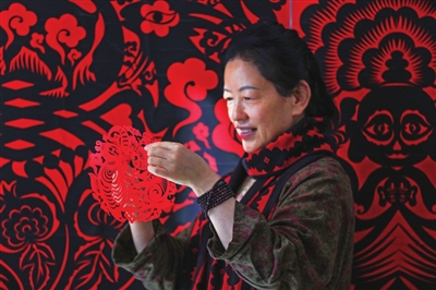 “梅花剪”创始人郭梅花正在创作马年剪纸
