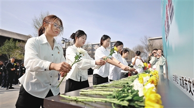 献花环节庄重肃穆,全体人员手持菊花,依次向革命先烈敬献鲜花。黄白交织的花瓣在春风中微微颤动,寄托着无尽的追思和深沉的敬意。一旁的留言板上,贴满了手写寄语“山河无恙,烟火寻常”“这盛世如您所愿”“我们会接续奋斗”……每一笔都是跨越时空的深情回应。