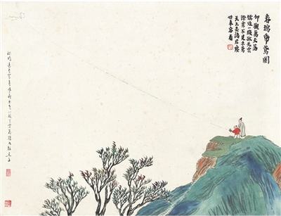 现藏于辽宁省博物馆的《春瑦纸鸢图》,是齐白石《石门二十四景》之一。“瑦”本意是指一种似玉的美石,齐白石用春瑦一词旨在形容春日景色的温润,就像美玉一样。画家以写意的手法,描绘了峭壁山石一片葱绿,旁边一树冠枝繁叶茂,绿树翠风,生机勃勃。在山石之上,一红衣少年手中的风筝已飘向高高的空中,另一褐衣老者似在指导少儿放风筝。上有题识:“仰观万丈落儒冠,一线欲飞云际寒。不见木鸢天上去,诸君尘世未曾看。”
