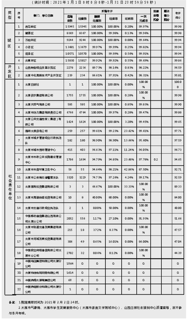 2021年1月1日至31日,市综合管理服务平台共受理各类问题132477件,采集员自行处置简易问题10294件,立案派遣二级平台101823件,二级平台处置结案93306件,总体结案率92.4%。该月城市管理热点问题主要反映在乱堆物堆料、道路不洁、暴露生活垃圾、供热管理、通信交接箱损坏等方面。 该月,市城管指挥中心对全市范围内积存垃圾渣土及公厕管理中的环境卫生情况进行全面摸底普查,协助城管局指导各城区进行专项整改。