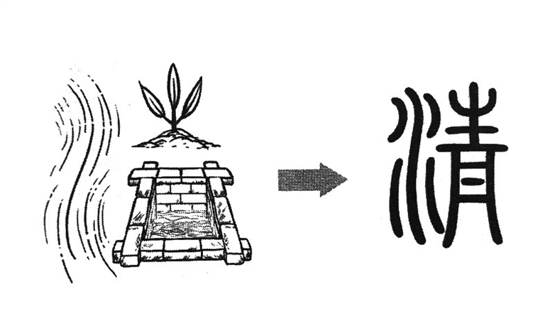 “清”字本义为水清,是一个形声字。其古文字形左边像是流水,表示该字与水有关;右边为“青”,是说河水清澈时呈青色。后来,“清”字引申为纯净之义,如清澈。现在,这个字还有“安静、不烦杂”的意思,如“清静、清幽”。该字用作动词,意思是“清理、清除”,如“清定”是清理考核的意思。
