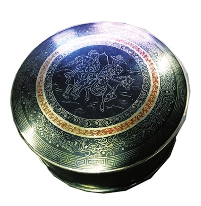 曹女士的这件器物是一组套盒,非常精美。外盒盒盖中间饰一幅“千里走单骑”图,向外依次为云纹、缠枝花卉纹、烧古工艺图案及寓意富贵不断的回字几何纹。最为特别的是,铜盒周边有诗一首,诗中的“铜雀”“龙尾”均指砚台,系文房四宝之一,我依此推断,这是一件非常少见的清代“乌铜走银”墨盒。