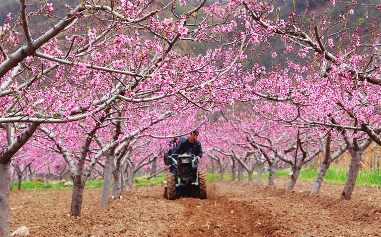 | ▲4月5日,河北省石家庄市井陉县测鱼镇杨庄村村民驾驶农机在桃园里作业。新华社发 (张秀科 摄) |