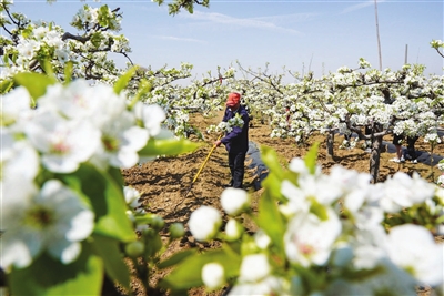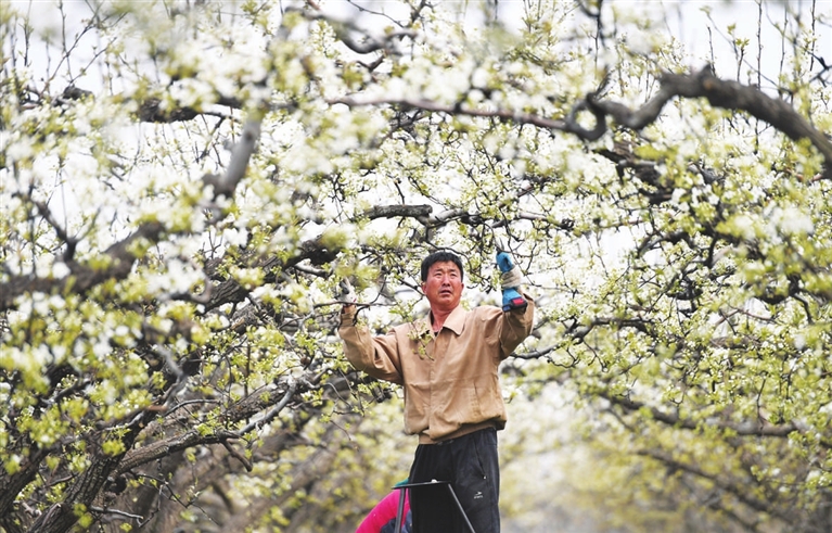 | ◀4月5日,河北省雄安新区雄县雄州镇马蹄湾村果农在梨园为梨树剪枝。新华社记者 朱旭东 摄 |