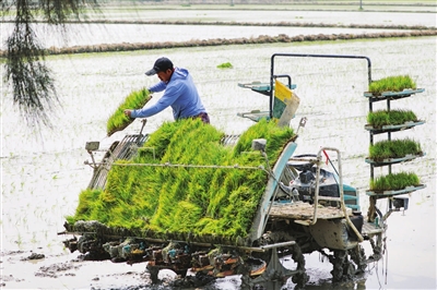 | 4月5日,在福建省晋江市九十九溪水稻高效栽培科技示范基地,工作人员将秧苗摆放在插秧机上。 新华社发 (赖进财 摄) |