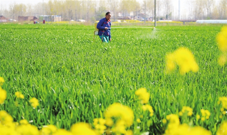 | 4月5日,江苏省淮安市淮阴区凌桥村村民在喷洒农药。