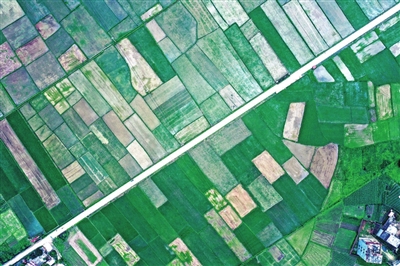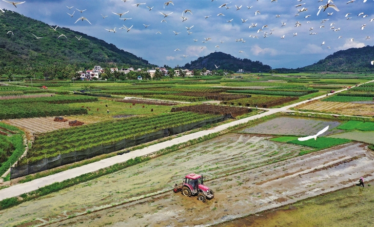 | 4月5日,海南省陵水黎族自治县光坡镇的农民在田间劳作(无人机照片)。