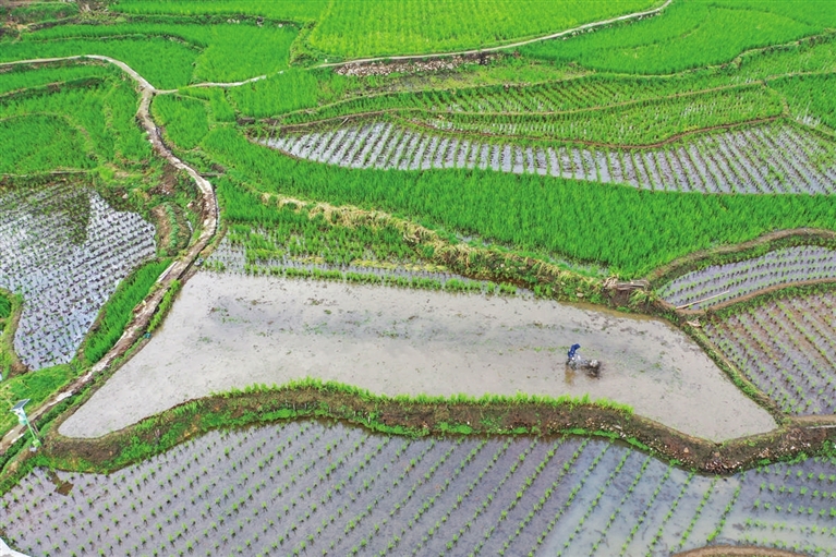 | 4月5日,村民在浙江省丽水市景宁畲族自治县大漈乡梯田里翻耕,以备种植茭苗(无人机照片)。 新华社发 (李肃人 摄) |
