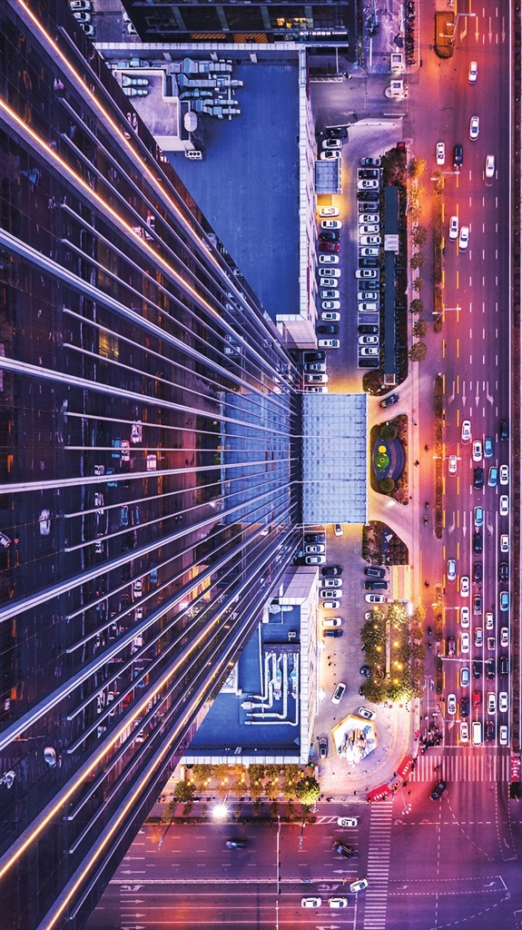 夜幕降临,华灯初上,给城市涂抹上一层金色光晕。作者在太原长治路一座高楼上俯拍,视角独特,构图讲究。楼体的条状装饰物与街道上的标线及排列有序的汽车,在超大广角中,共同构成了一幅富有节奏感和韵律美的城市街景图。 ——编者