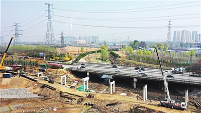4月6日,新建的杨兴河景观桥建设工地上,工人们开始在桥墩上架设钢梁。该桥位于滨河东路西侧、阳兴大道附近,全长200米,桥宽8.5米。作为滨河自行车专用道工程的一部分,未来,市民可骑行在桥上,一边锻炼身体,一边沿途欣赏汾河景区的美景。米国伟 摄