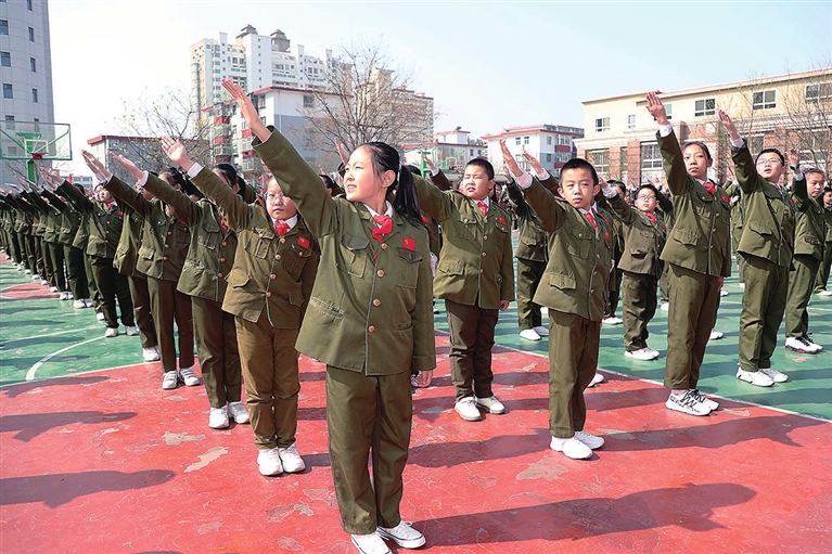 活动在雄壮的国歌声中拉开帷幕。启动仪式上,孩子们集体演唱爱国歌曲,一首首耳熟能详的歌曲在孩子们高亢的童声中,一遍遍回响在操场上空。最后全体师生一同宣誓,“坚定理想信念,续写百年荣光!学党史、知党恩、听党话、跟党走!”