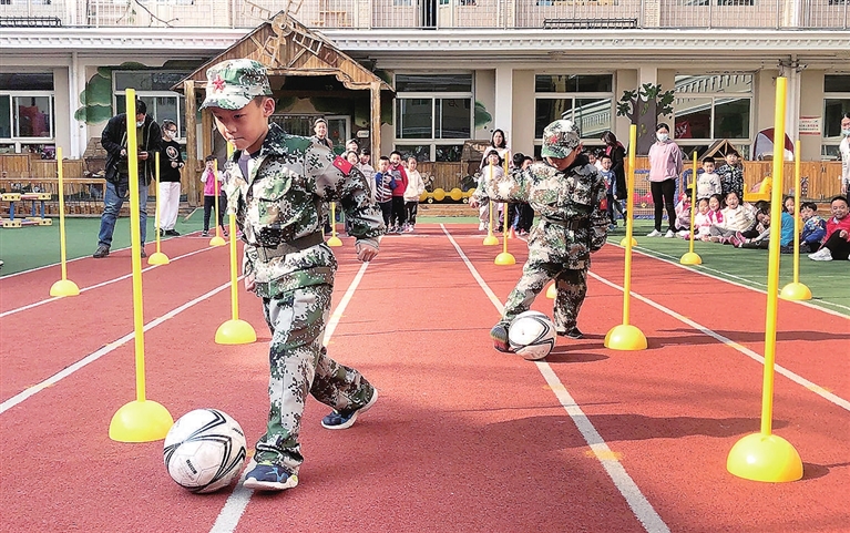 4月7日,育蕾幼儿园内,孩子们正在进行趣味体育训练。我市各中小学、幼儿园积极推行科学化体能训练,让孩子们感受体育运动的乐趣。