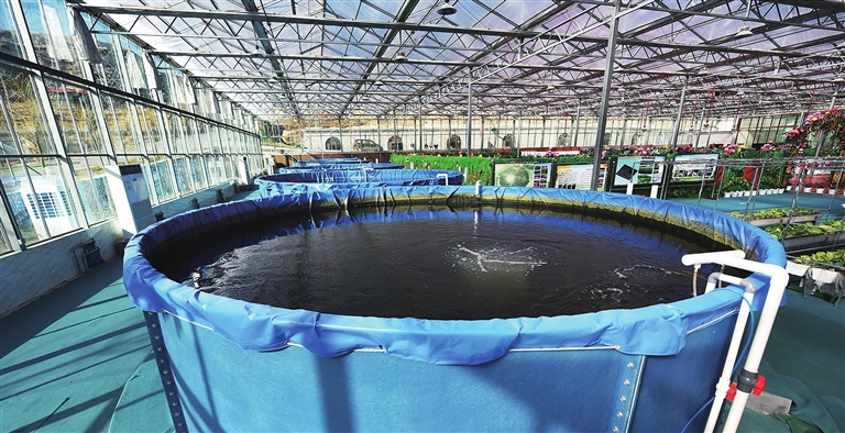走进园区的鱼菜共生大棚,水声潺潺的温室大棚里,满眼深深浅浅的绿色,那是鲜嫩清爽的小白菜、茎叶肥大的生菜、药食两用的田七……颇为奇特的是,这些自由生长的蔬菜没有扎根于泥土,而是端坐在一个个由白色泡沫板制成、手掌大小的小“板凳”上,“凳子”则漂浮在连接着养鱼池的方形水池上,蔬菜的根系穿过泡沫板的孔洞,伸入波光闪烁的水面。