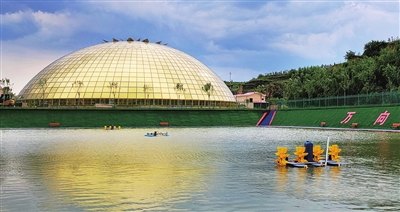 为了打造文旅康养度假区,这里建成了多个功能区域:让游客置身于林木花草间享受美食的生态餐厅、可供观赏研学的日升药博园、集康养休闲于一体的穹顶温泉疗养中心、可体验北方农村居住特色的窑洞民宿,以及户外垂钓园、萌宠乐园、健康步道、生态散养基地……在好山好水好作物的依托下,园区规划建设生态康养为衍生产业,配套建设康养中心、康复医院、健康管理中心等,结合药博园等特色产品研发药膳,从而达到养生、养心、养老的健康守护目的,打造一片远离尘嚣、滋养身心的康居福地。