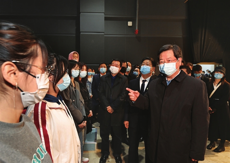 四月的山西传媒学院校园生机勃勃,处处洋溢着青春、梦想和激情。楼阳生来到学院演播中心,听取学院专业设置、教学条件、师资水平、科研创作等情况介绍,走进黑匣子剧场,现场观摩正在排演的山西本土舞台剧《豫让刺赵》,走进影视摄影棚、音乐录音棚,了解电影创作过程和摄制技术,实地察看录音艺术实训教学,与张宏、李少红、贾樟柯等就影视创作、电影产业发展等深入探讨。随后,楼阳生来到现场师生中间,与大家亲切交流。他说,电影是一门艺术,能够给人以美的感受,为人民群众提供丰富的精神食粮。你们作为山西电影学院诞生的见证者、参与者,要好好学习、健康成长,将来用自己的精品佳作记录时代、讴歌人民、致敬英雄。楼阳生强调,成立山西电影学院,是省委关于高等教育“三个调整优化”的又一重要决策,是山西高等教育发展史上具有标志意义的一件大事。山西传媒学院山西电影学院要深入学习贯彻习近平总书记关于文艺工作的重要论述和关于推进电影事业发展的重要指示精神,以人才和作品为金标准,创新体制机制,加大人才引育力度,产学研创展一体化发展,夯实基础,开创新局,培育影视产业集群,打造特色鲜明、国内知名的电影学院,为建设文化强省提供支撑。