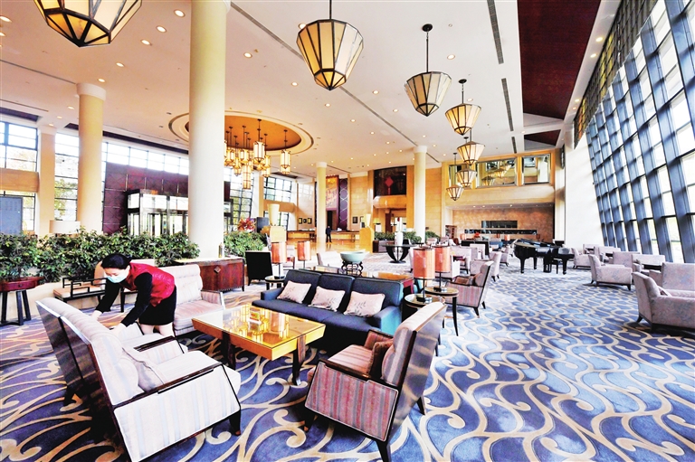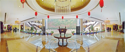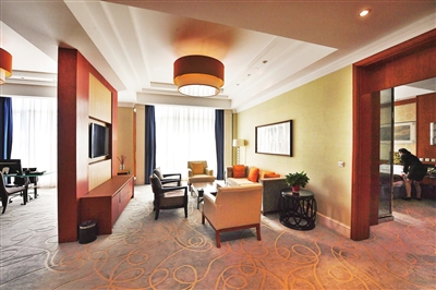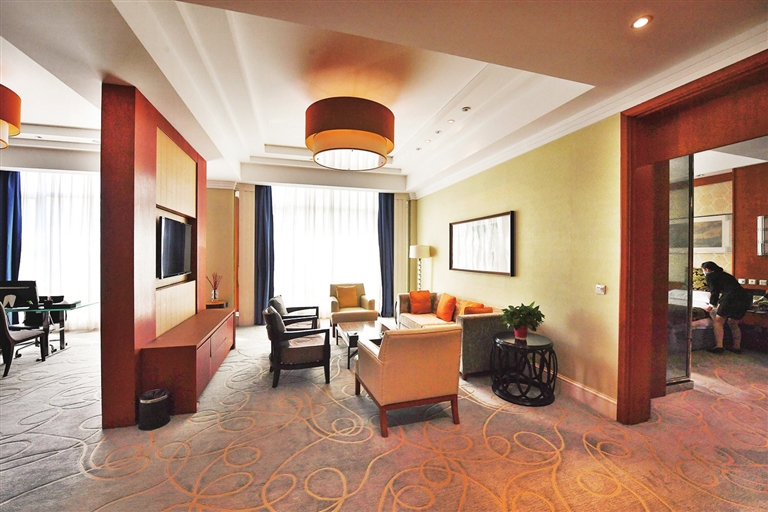 宾馆内的11幢风格迥异、构思新颖、设计独特的别墅式接待楼,其客房装修以现代设计与中国古典建筑风格相结合,兼具现代装饰、欧式装饰及中国古典装饰之所长,庄重典雅、美观大方,既彰显尊贵与大气,又体现细节之美,洋溢着中西合璧的文化气息,给宾客带来无穷的意趣。