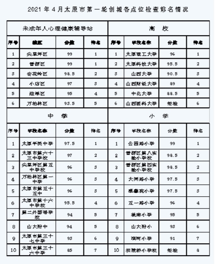 市创城办近日组织人员开展了4月第一轮创城实地点位检查工作,对各城区的高校、中学、小学、未成年人心理辅导站及公共文化设施等点位及周边的环境秩序情况进行了检查,检查中发现高校、中(小)学存在宣传氛围不浓厚,环境卫生、公共秩序等问题有反弹回潮现象,学生思想道德教育、公益宣传、文明校园创建等工作不到位,不能坚持常态等问题,个别高校、小学不配合创城检查工作情况。