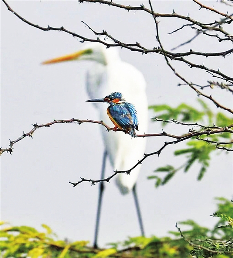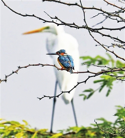 作者巧妙地运用大小对比来完成画面的布局,前景的彩色翠鸟在背景模糊白鸟的反衬下突出出来,形成视觉中心,点明主题。