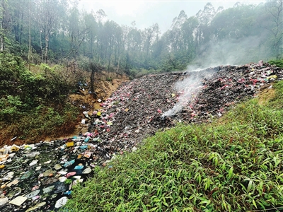 滚滚浓烟冒出,呛鼻的恶臭四溢。旁边的小山坡上,垃圾堆到了半山腰,并冒着烟,虫蝇四处飞舞。
