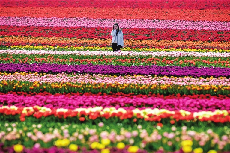4月22日,游客在德国格雷文布罗赫的郁金香花田中赏花。 新华社/欧新