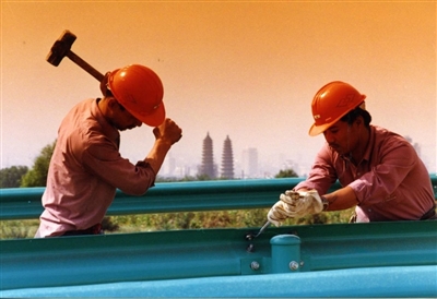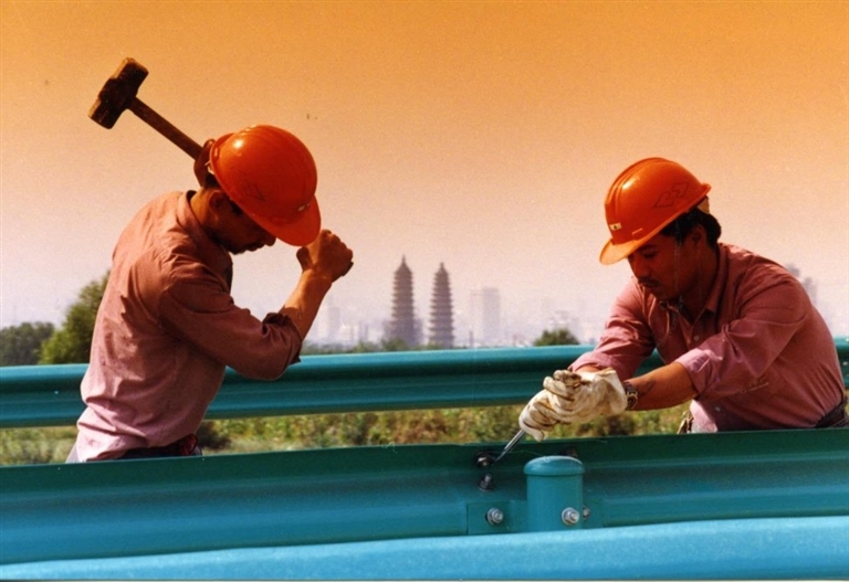一人紧握扳手,一人奋力挥锤。与远处的双塔形成了鲜明的动静对比,以此凸显劳动之美。 李晋钢 摄