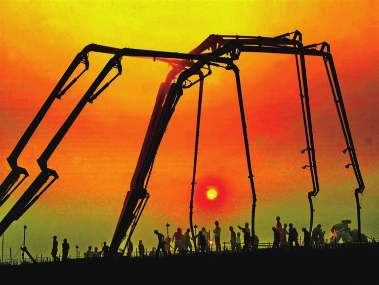 日落时分,施工机械与施工者裁出生机勃勃的剪影。 李晋钢 摄