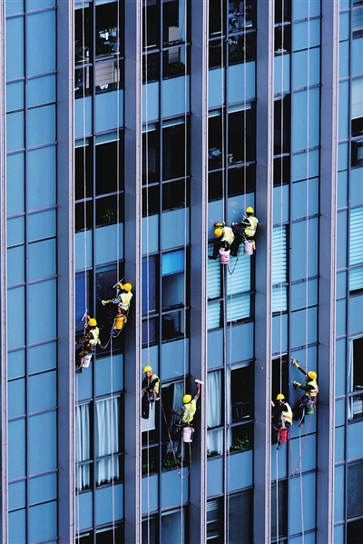 一群“蜘蛛人”悬于大楼外。清洗工的黄色马甲和头盔在灰蓝色背景下格外抢眼。 李苏霞 摄