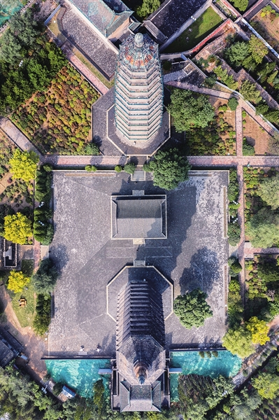 双塔高耸,历史厚重。 “文峰”“宣文”,两座塔久享“文笔双峰”美誉,犹两管巨笔,书写太原锦绣华章,描绘太原美丽画卷。 俯拍的方式诠释着双塔的深邃意境。 ——编者