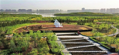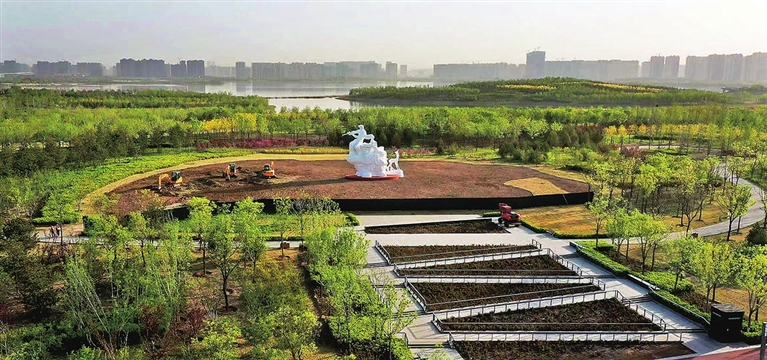 4月27日,在晋阳湖公园里,“晋泉之声”雕像矗立在南广场,一旁的工程机械正忙着平整地面,为绿化美化做准备。据了解,该雕塑原位于五一广场,经切割、吊运和搬移,最终与游客相会于晋阳湖公园。 韩双喜 摄