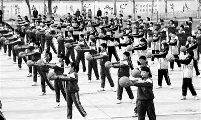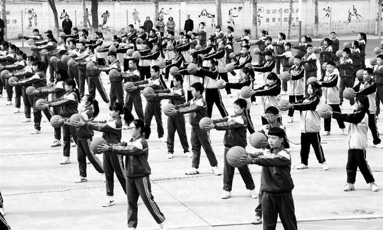 每日课间操活动时间,山西省晋中市太谷区朝阳学校千余名中小学生都会随着音乐练习其自主排练的篮球操。据悉,该校把篮球作为特色项目,通过篮球操等形式培养学生的篮球兴趣爱好,丰富校园文化。 孙泰雁 摄